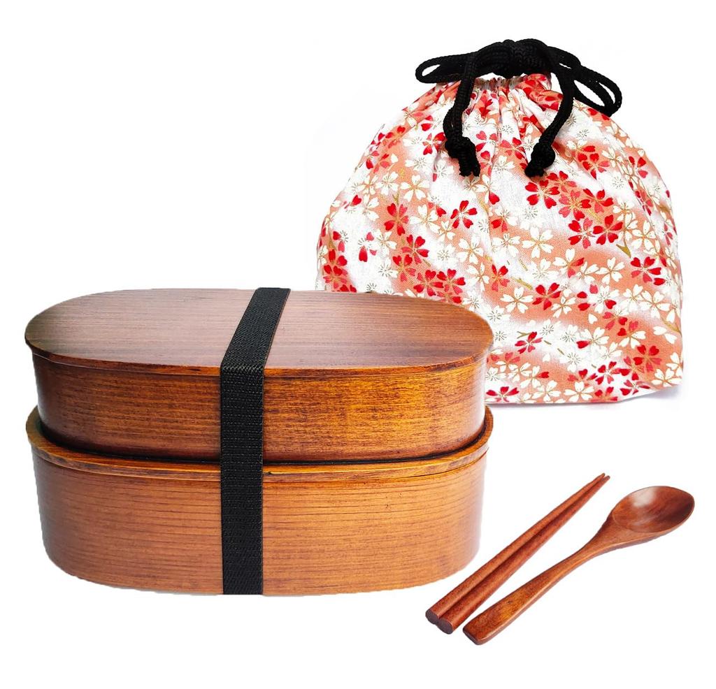 [Two-tiered bento box set] Set contents: A 5-piece set including a bento box, wooden chopsticks and spoon, a drawstring bag, and a rubber band. No need to buy anything extra. Size of the bento box: Approx. 19x10x9.5cm (including lid), capacity: upper tier 450ml, lower tier 550ml. Weight: Approx. 230g. Can be used with either one or two tiers. *The length of the chopsticks and spoon is only 16.5cm for easy storage.