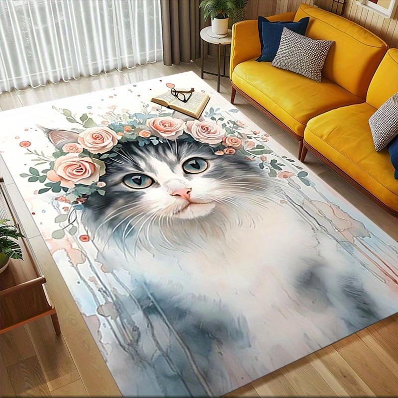 1pc Flower Crown Cat Themed Rug for Home Decor, Non-slip Office Carpet, Chair mat, Outdoor Mat, Christmas and Halloween gifts-0731023