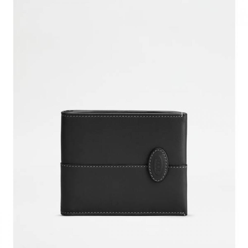 The Tod's Card Wallet XAMDBSC8300UPPB999 is made of soft calfskin leather. It features iconic stitching at the center and a stamped Tod's logo on the front. Inside, it has flat pockets and card slots, providing both practicality and style.