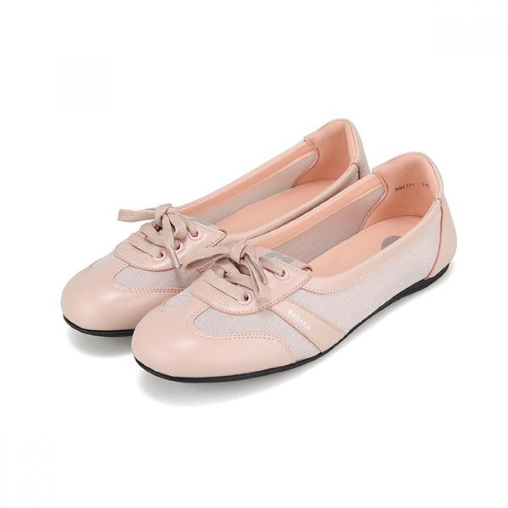 The BABARA Mesh Flat BBI531PK is a women's flat sneaker made from fabric mesh, featuring a sheer design. This product offers a lightweight feel and excellent breathability, with a round toe shape that provides an elegant touch. The soft leather material minimizes skin irritation, and a plush cushion insole ensures comfort even during long wear. Available in pink and silver color options that enhance femininity.