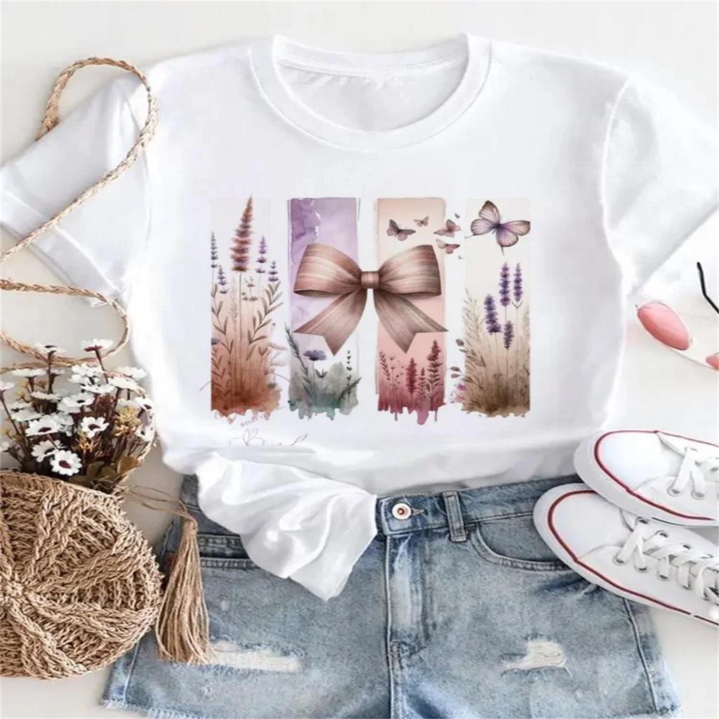 Bow Print T-Shirt For 90s Clothing Casual Regular Top O-Neck Women's Cartoon Pattern Short Sleeved Printed Women's T-Shirt