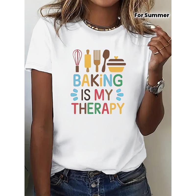 European sizes Women'S Casual "Baking is My Therapy" Graphic T-Shirt - Short Sleeve Crew Neck, Summer & Spring Top with Baking Icons