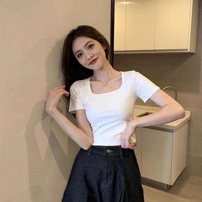 Solid Color Right Shoulder Women's Square Neck Short Sleeve Crop Top Slim Fit Knit T-Shirt