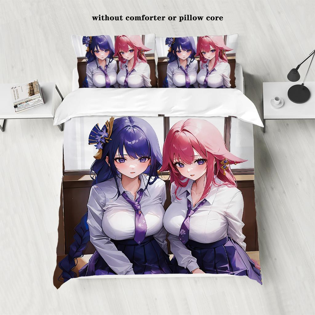 3dílný kreslený anime dívčí vzor tištěný péřový povlak na přikrývku (1dílná sada+2 povlaky na polštáře, bez výplně) ložní souprava