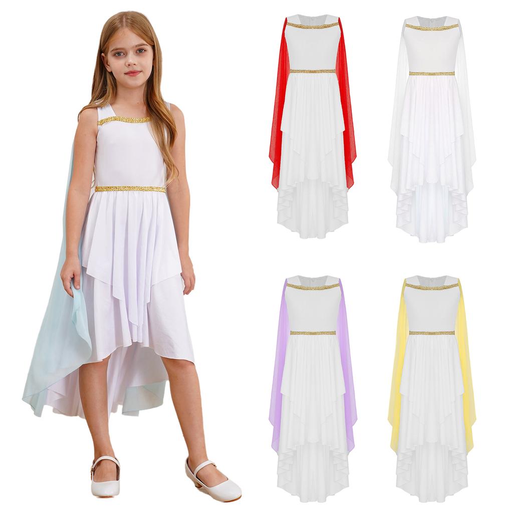 Multikulturní princeznovský kostým pro dívky na Halloween: Starořecké/Římské Toga Šaty s Odnímatelným Šálem & Patchworkovou Sukní