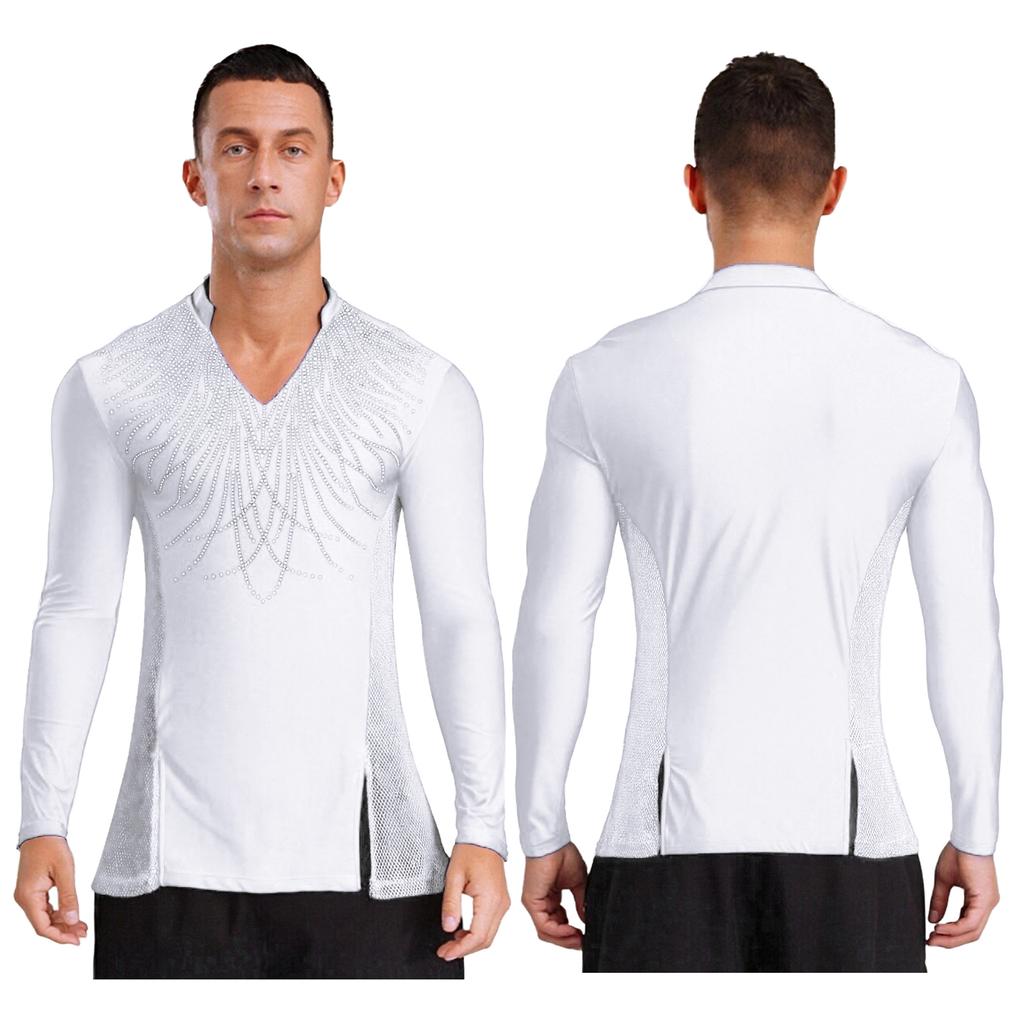 Pánské třpytivé kamínkové taneční top s límečkem do V, dlouhým rukávem, bočními síťovanými díly, patchworkem a rozparky, oblečení do tanečního sálu