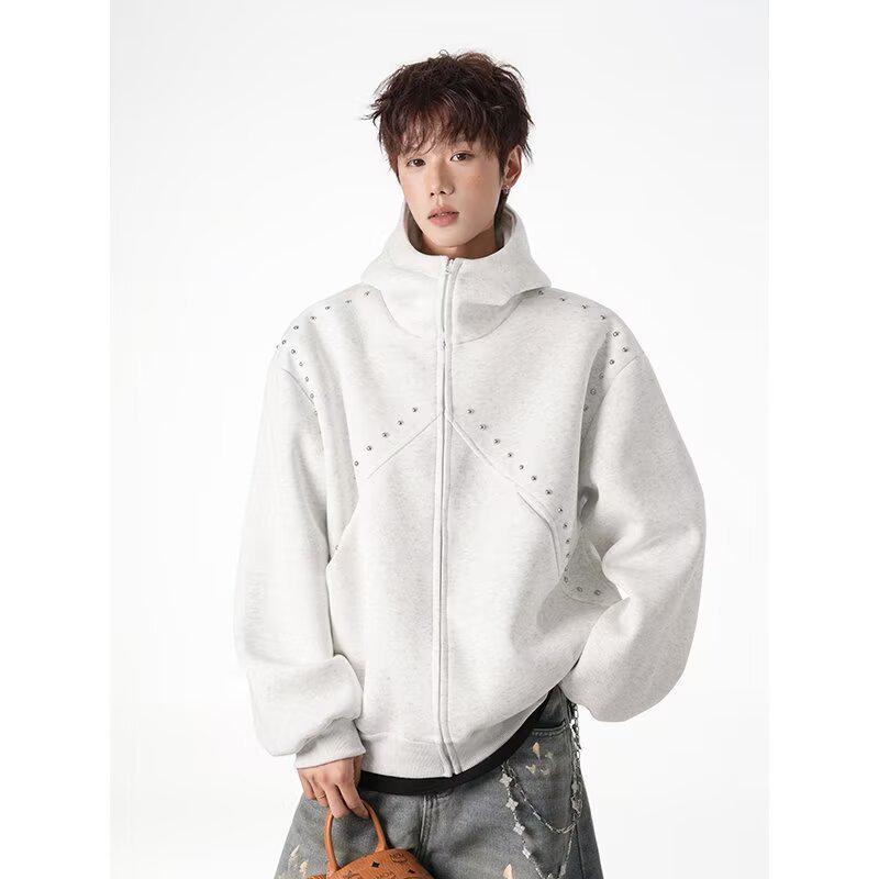 Men's Retro Rivet Hooded Cardigan: Trendy Autumn/Winter Streetwear Zipper Jacket with Plus Velvet
