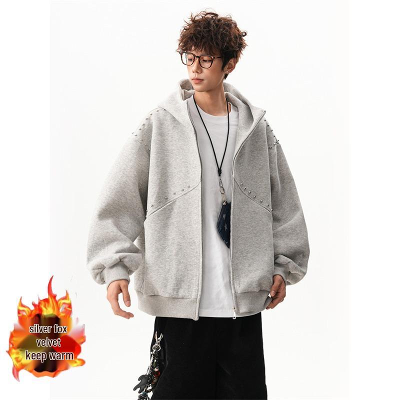 Introducing a stylish and comfortable cardigan that combines retro street style with modern flair. This long-sleeved, loose-fitting piece is crafted from luxurious rabbit fur and lined with a soft velvet interior for added comfort. Its thin construction makes it perfect for layering in various weather conditions. The solid pattern offers versatility, while rivet details and a practical hood enhance its edgy appeal. This unisex cardigan is designed for those who appreciate unique style and superior comfort.