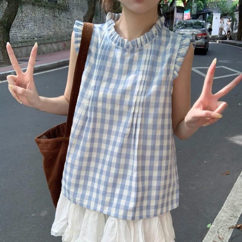 Women's Sleeveless Shirt Korean Version Loose Round Neck Plaid Pleated Famale Shirts Summer Daily Comfortable Sweet Beauty Style Ladies Top