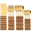 16pcs Cutlery Set Stainless Steel Natural Bamboo Handle Dinnerware Kitchen Flatware Includes Forks Spoons Knives Tableware