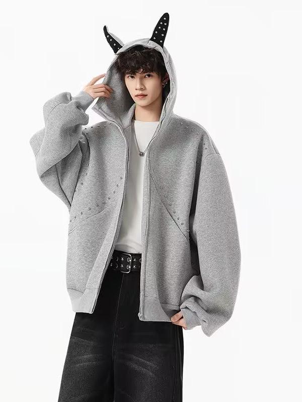 Men's Autumn/Winter Designer Rivet Patch Doberman Ear Hooded Sweatshirt - Trendy Versatile Heavyweight Cardigan Jacket