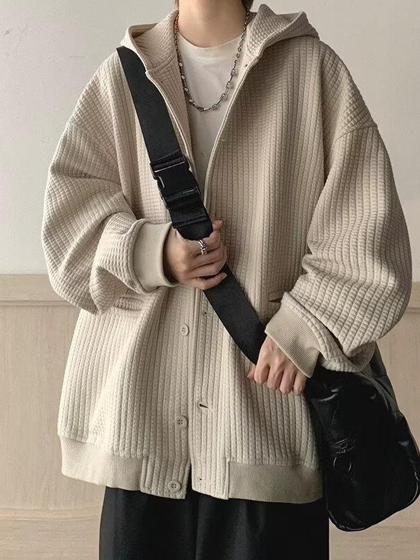 Men's Oversized Retro Waffle Knit Hooded Sweatshirt - Heavy-Weight Casual Jacket for Spring & Autumn by Trendy Brand