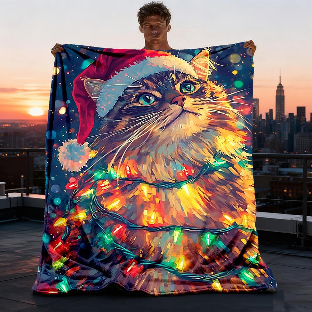 1pc Christmas Cat Outdoor Soft Polyester Flannel Throw Blanket Versatile for All Seasons , Soft , Cozy , Warm All Season Quilted Throw ,