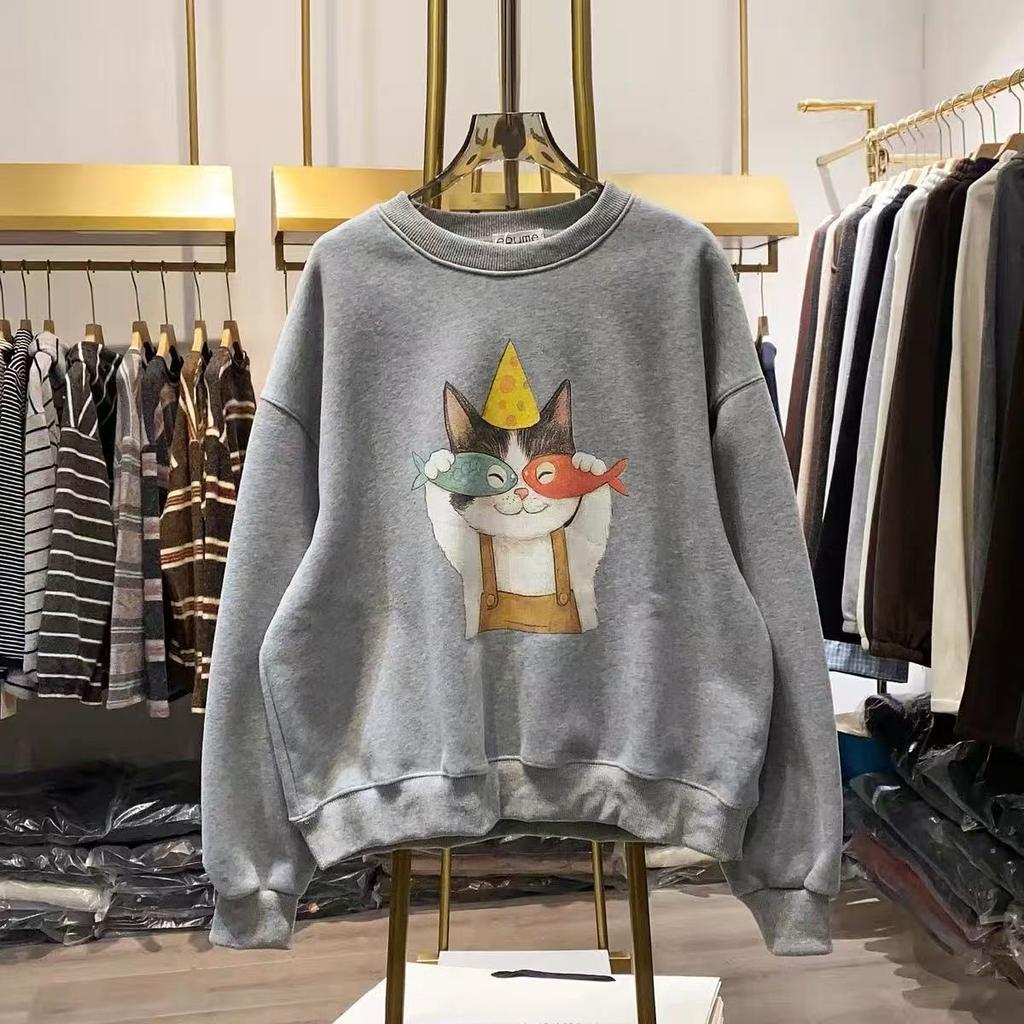 Round-neck Fleece Pullover Women's New Style Loose Cartoon Cat Hooded Casual Fall/winter Thick and Warm Top