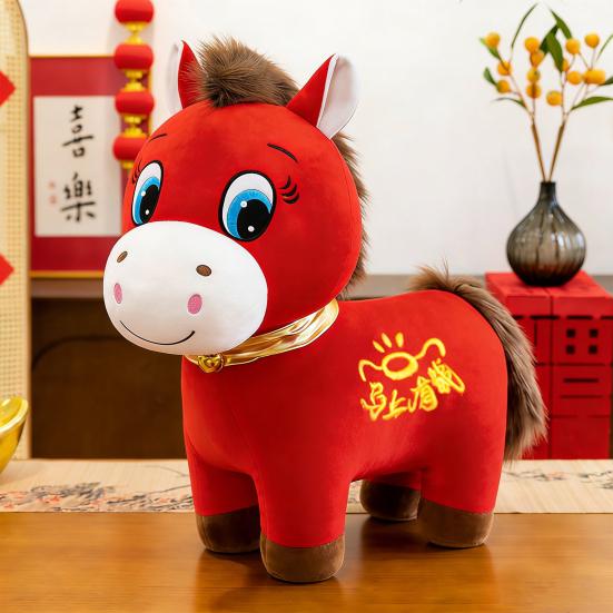 Tento plyšový kůň, vyrobený z prvotřídní plyšové látky, nabízí měkký, pohodlný a netoxický pocit, což ho činí bezpečným pro děti i dospělé.. Vyznačuje se slavnostním červeným barevným schématem symbolizujícím štěstí, je zdobeno zlatými akcenty a žlutým vyšívaným textem „make money soon,“ představujícím bohatství a prosperitu. Ideální pro sváteční dárky nebo domácí dekoraci.. Jedinečný design zobrazuje dvě výrazné tváře: usmívající se „Smějící se kůň“ a plačící „Plačící kůň“, které přinášejí poutavý emocionální zážitek.