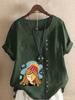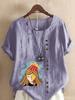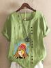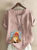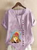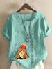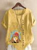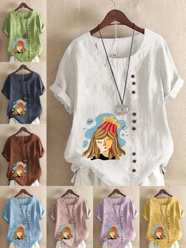 Women's Fashion Abstract Girl Print Round Neck Short Sleeve T-shirt Summer Casual Cotton Linen Graphic Shirt Leisure Loose Blouse Tops