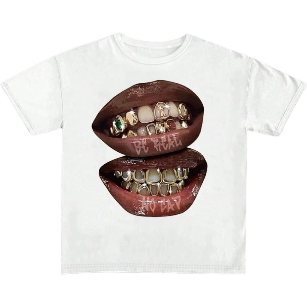 Verdusa Women's Lips Print Graphic Tees Y2k T Shirts Summer Crew Neck Vintage Going Out Tops