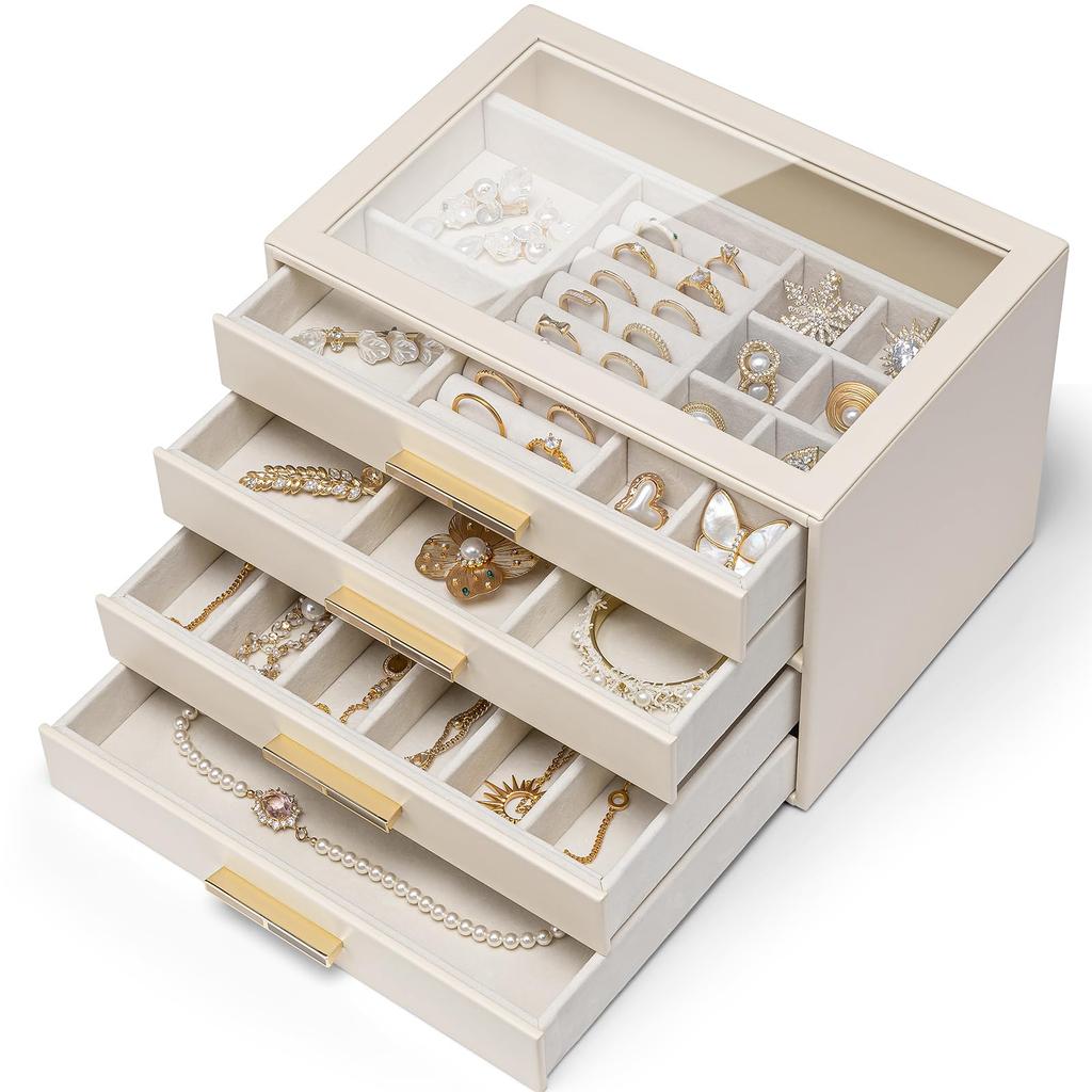 【Simple Layout, Plenty of Storage】Rings in the slots, earrings in the small compartments, necklaces in the delicate ones. What else? With various layouts and compartments, this jewelry organizer keeps all your accessories organized, from bracelets to studs. 【Perfect Gift】 This 4-tier jewelry box is the perfect gift for mothers, grandmothers, daughters, and wives. Surprise a woman with an unexpected gift on occasions such as White Day, birthdays, weddings, inaugurations, graduation ceremonies, Valentine's Day, Mother's Day, and Christmas!
