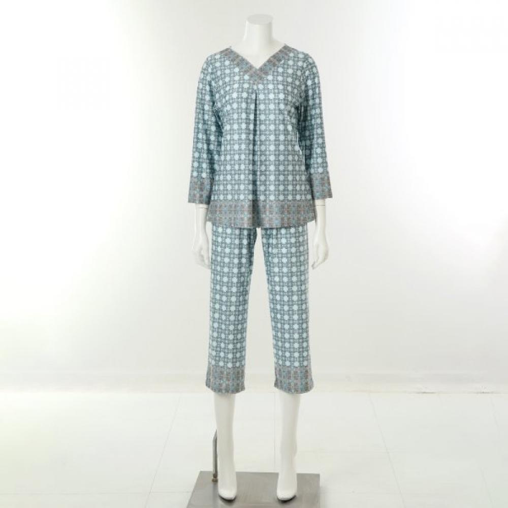 The Wakoru Women's Roomwear Set 50D Span Geometric Print (WPA379WS/WPA379WP) delivers a sophisticated feel with its geometric pattern and boasts great elasticity and lightweight wear due to its polyspan material. It also features excellent washability, making it suitable for easy wear.