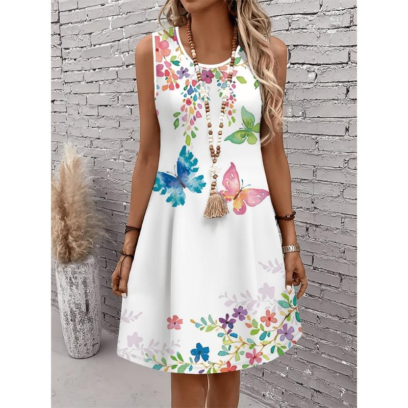 Summer New Women's Sleeveless Dress Butterfly Floral Pattern Round Neck Dress Elegant Temperament Fashion Women's Dresses