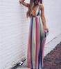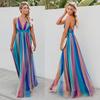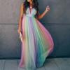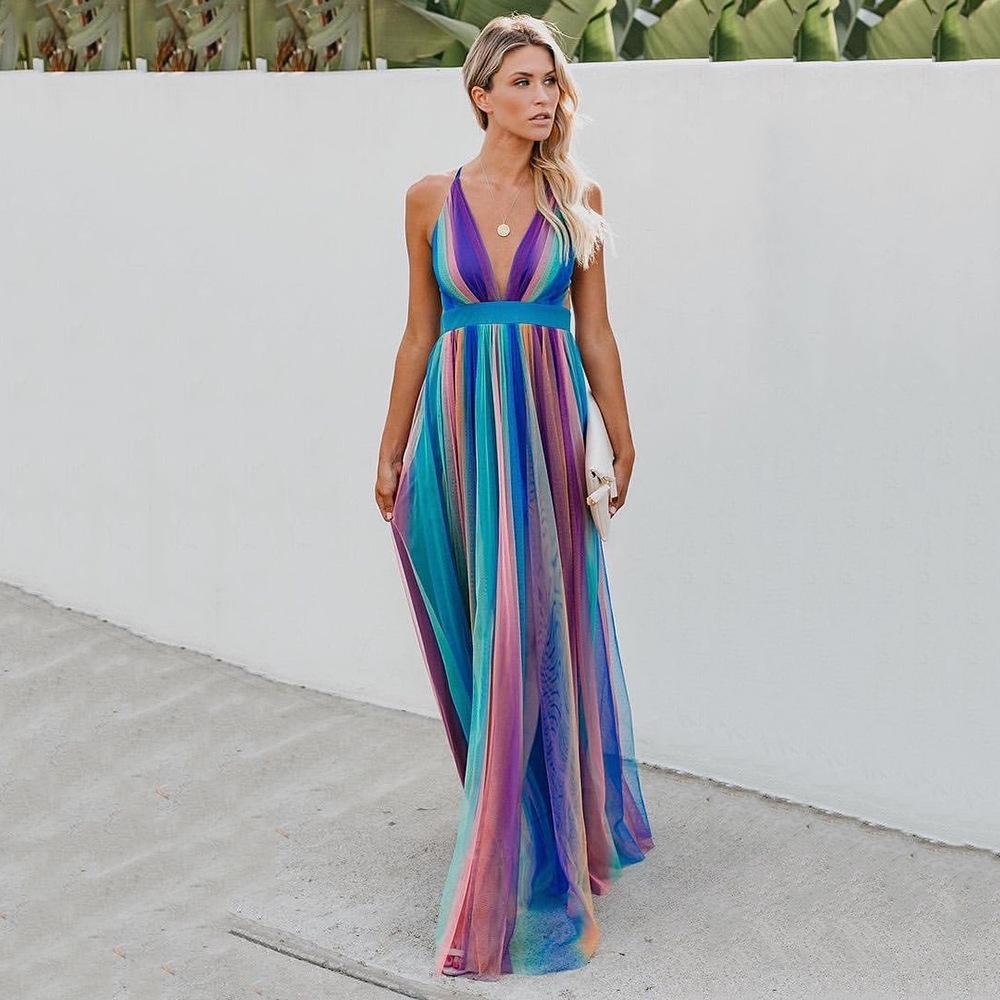 Nové jarní a letní evropské a americké, dámské dlouhé šaty sexy hluboký V duhový síťovaný overal, šaty
