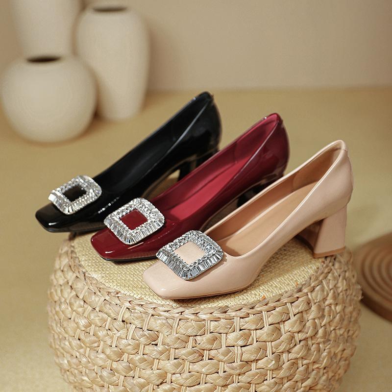 French thick heel light mouth single shoes spring and autumn red wedding shoes rhinestone square buckle nude square head high heels