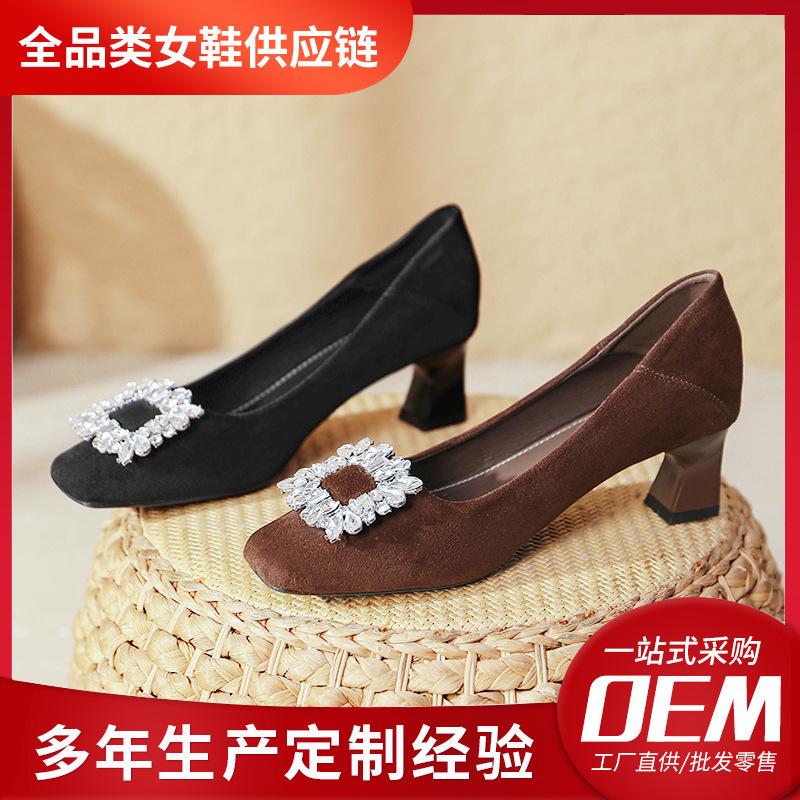 Customized shoes~ thick heel single shoes spring and autumn shoes suede temperament medium heel rhinestone square buckle French square head high heels