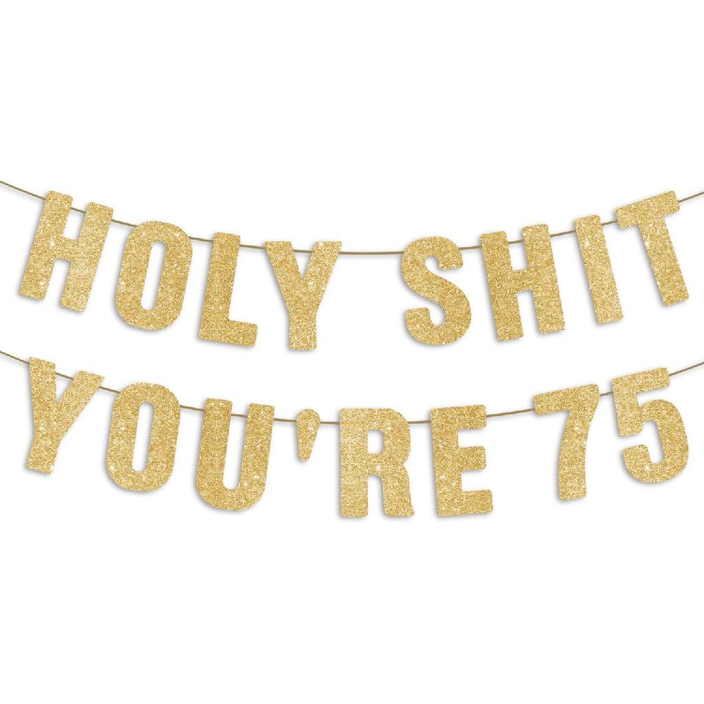 Pre-Strung Holy S You’re 75 Gold Glitter Banner, Happy 75th Birthday Decorations for Men, Funny 75 Years Old Party Sign for Women