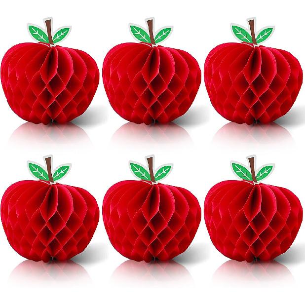 6 Pack 4.3 x 5.7 Inch Apple Honeycomb Decorations, Stand or Hang Tissue Paper Centerpieces, 3D Red Fruit Ornaments for Back to School, Teacher