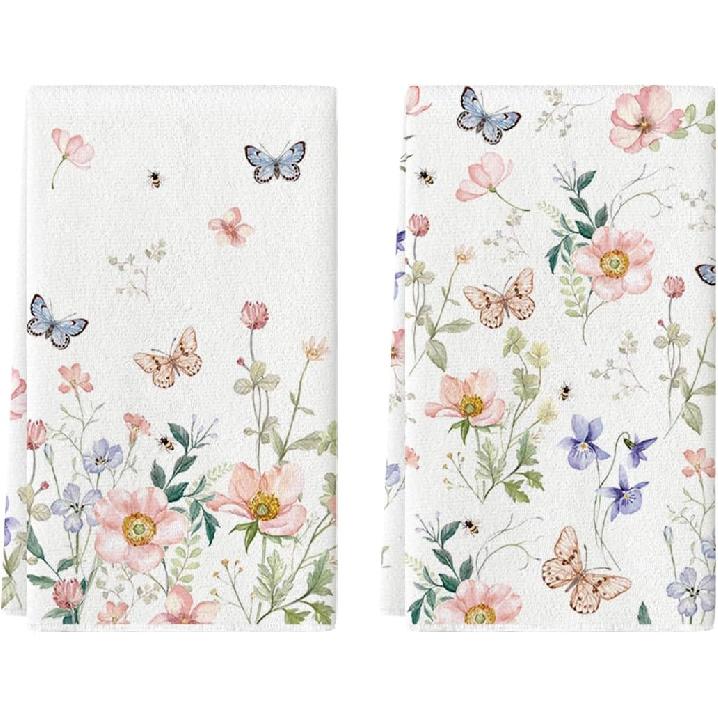 Artoid Mode Floral Leaves Butterfly Spring Kitchen Towels Dish Towels, 18x26 Inch Seasonal Summer Decoration Hand Towels Set of 2