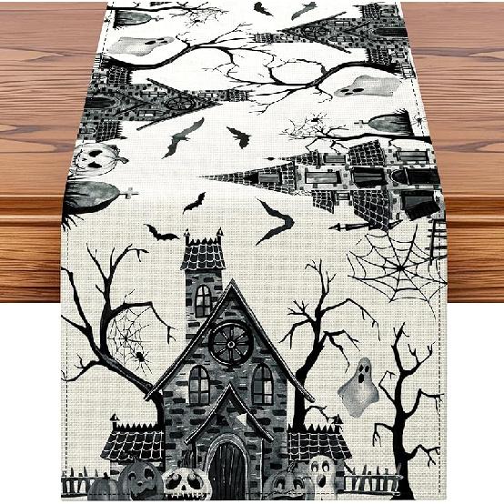 Artscope Black White Spooky Haunted House Tree Ghost Halloween Table Runner, Halloween Holiday Kitchen Dining Table Decoration for Fall Home Decor