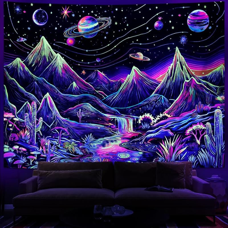 Leofanger Tapiz de montaña con luz negra, tapiz floral de plantas trippy, reactivo a los rayos UV, tapiz de pared con galaxia, planeta, cascada de