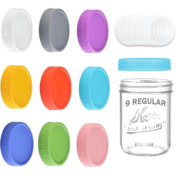 9 Pack Regular Mouth Mason Jar Lids - 70mm Colored Plastic Mason Lids with Silicone Rings for Ball, Kerr and More, Thickened & Leak-proof, Dishwasher