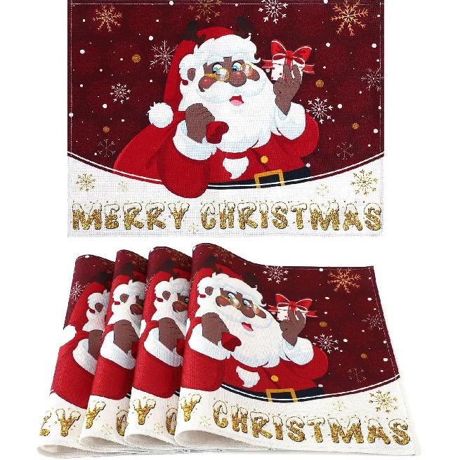 DECYOOL n n Christmas Placemats Set of 4, 12.5x17 Inch Black Santa Christmas Table Mats Merry Christmas Place Mats for Kitchen Xmas Party Winter Home