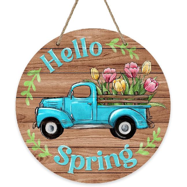 Deroro Hello Spring Blue Truck Sign for Front Door Decor, Tulip Flowers Pickup Wood Door Hanger for Outdoor Outside Porch, Rustic Farmhouse Wooden