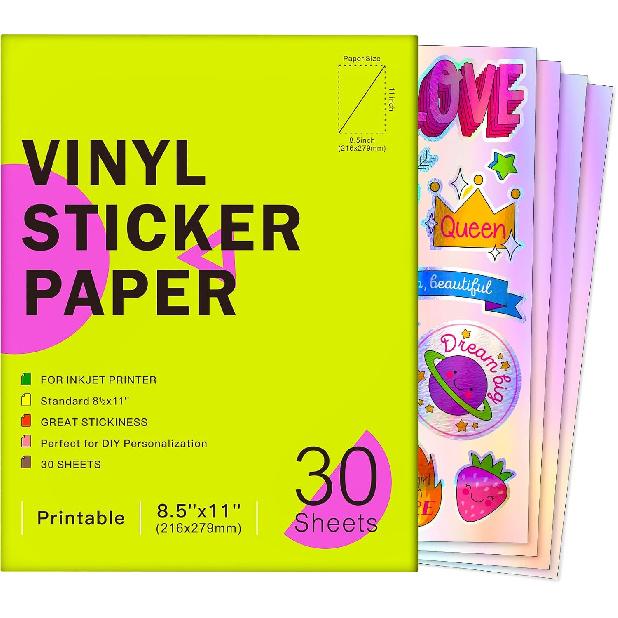 Holographic Printable Vinyl Sticker Paper for Inkjet Printer - 30 Sheets - 8.5" x 11" - Waterproof Labels Paper, Dries Quickly,Vivid Colors,Tear