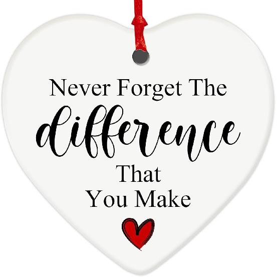 Never Forget The Difference You Make Ornament, 2.7 Inch Heart Shaped Ceramic Hanging Sign with pirational Quote, Appreciation Gift for Teachers,