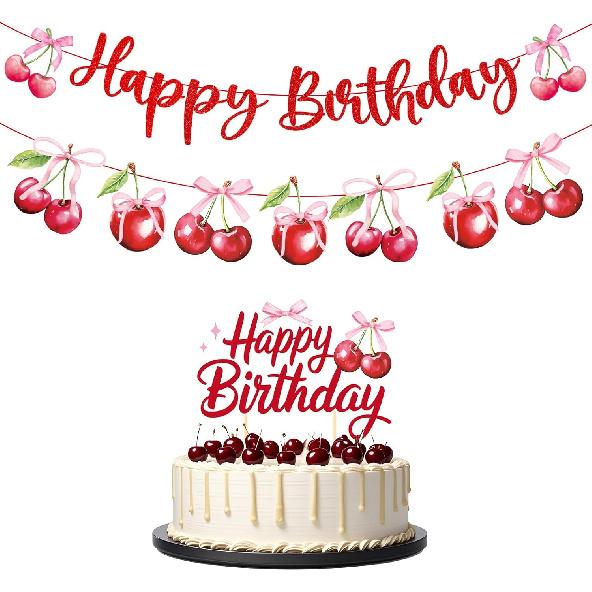 Cherry Birthday Party Decorations - Cherry Themed Banners Decoration Pink Bow Fruit Cake Topper Decor Supplies for Girls Women
