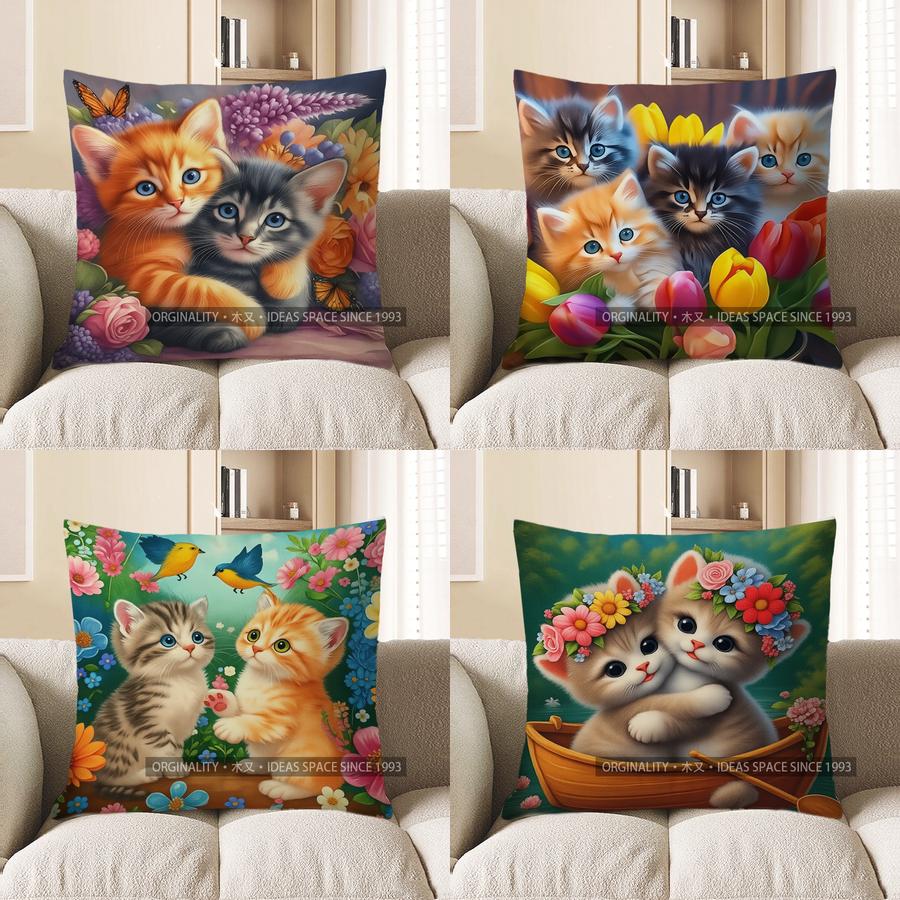 Home Decor Cute Kittens With Flowers And Butterflies Pillow Pattern Cushion Cover Suitable For Sofa Bedroom Car Pillow Cover