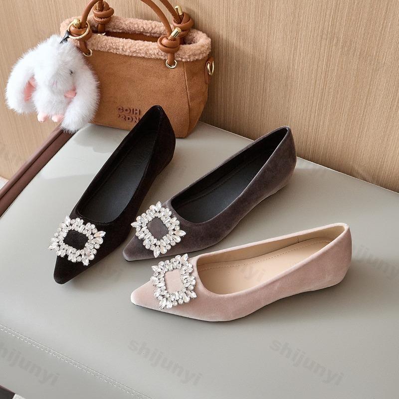 Women's Shoes 2026 Spring New French Pointed Toe Suede Shallow Mouth Flat Shoes Diamond Decorated Elegant Banquet Casual Shoes