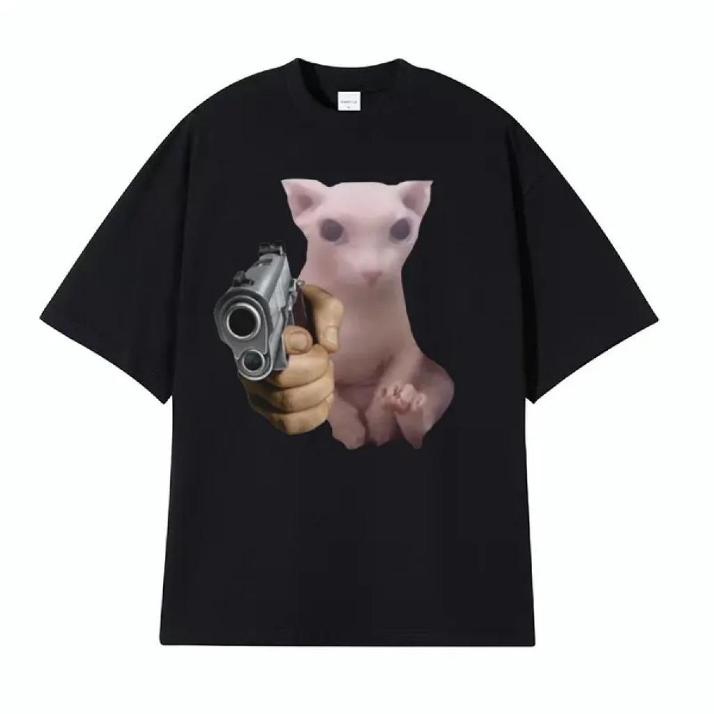 Funny Bingus with Gun Cat Meme Tee Shirt Men Women's Casual Harajuku Fashion T-shirts Male 100% Cotton O-Neck Loose T Shirt Tops