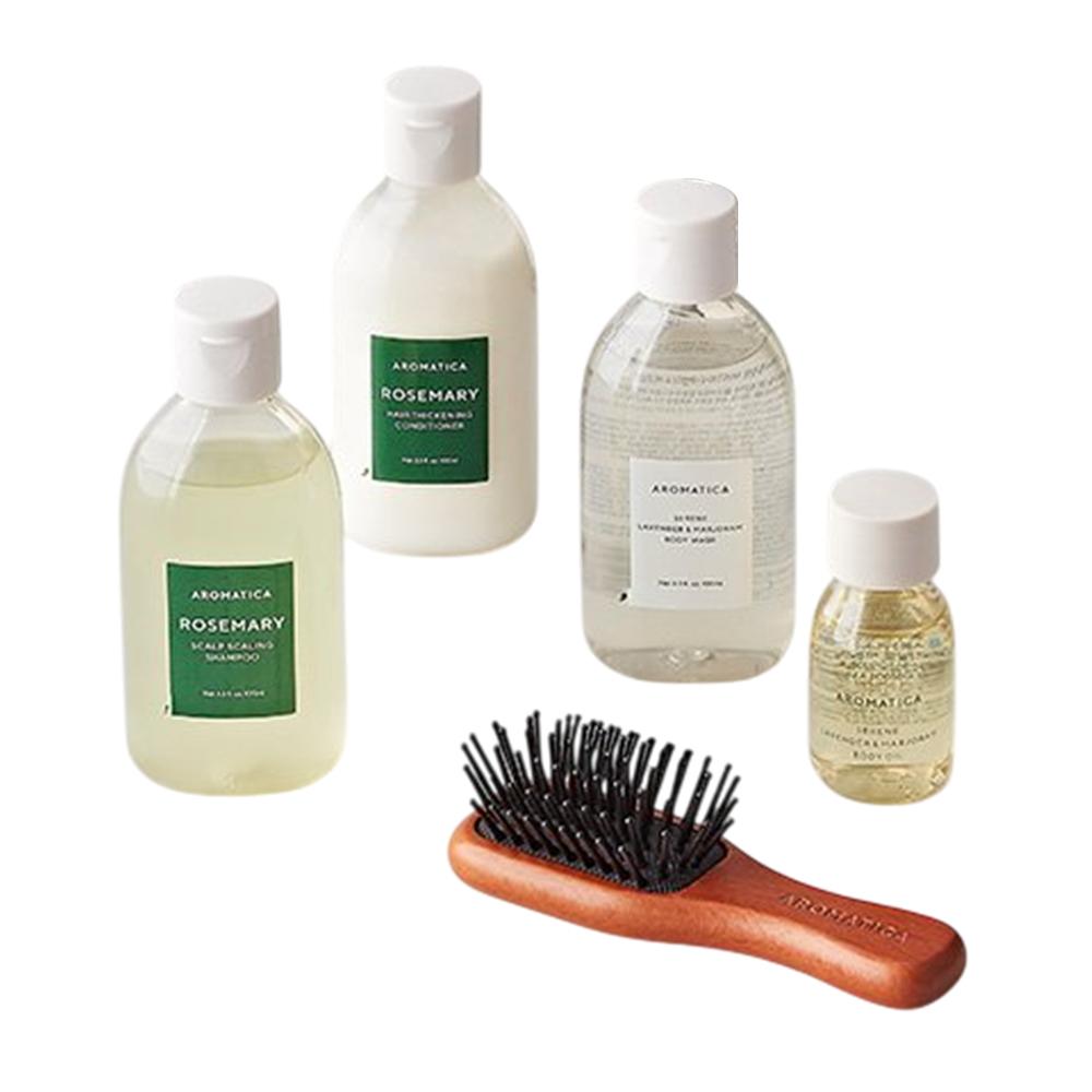 Přenosná sada Vše v jednom pro komplexní péči : Tato cestovní kolekce obsahuje základní produkty pro pokožku hlavy a tělo navržené tak, aby vám pomohly udržet vaši rutinu péče o sebe, ať jste kdekoli.. Sada obsahuje šampon Rosemary Scalp Scaling (100 ml) k jemnému čištění pórů pomocí BHA a Kondicionér pro zahuštění vlasů s rozmarýnem (100 ml) který používá přírodní oleje místo silikonu k udržení hladkých a pružných vlasů. Doplněno dřevěným kartáčem na pokožku hlavy a praktickým cestovním pouzdrem, zajišťuje zážitek z péče o vlasy profesionální kvality během jakéhokoli dobrodružství.