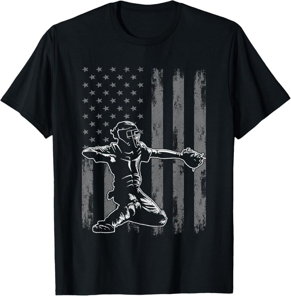 Baseball Catcher Shirt For Boys Men, Baseball USA Flag T-Shirt Unisex T-Shirt