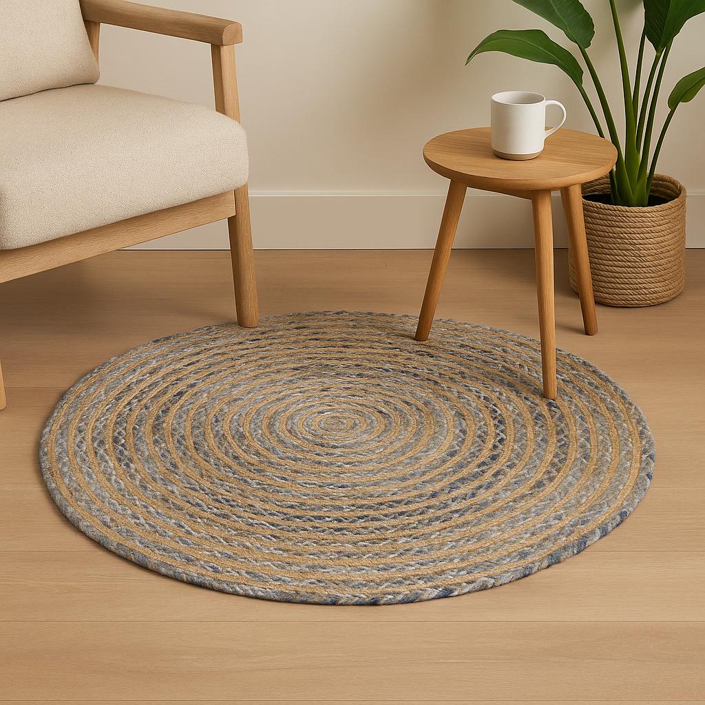 The round braid of natural jute and reclaimed textiles brings a grounded, tactile calm to the room. Earthy tan entwines with denim-blue tones, creating a soft-to-touch, sturdy surface that both anchors and accents your space. 🌿