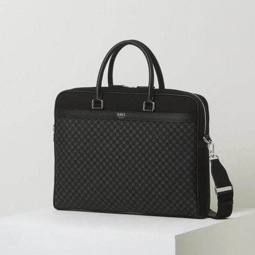The DBBA5F591BK (15-inch laptop compatible) Black DD Pattern Nylon Briefcase features a stylish design with leather accents, highlighting a logo pattern. Made of durable nylon material, it also comes with a detachable shoulder strap, allowing for 2WAY usage. It maximizes practicality with various storage spaces and includes a dust bag for convenient storage.