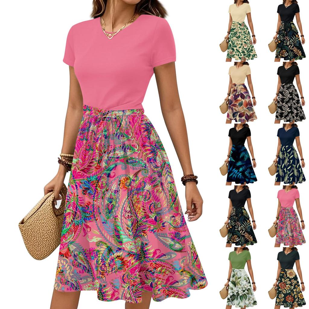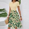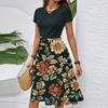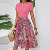 Dámské ležérní módní šaty s páskem, s květinovým potiskem, s krátkým rukávem, s kulatým výstřihem, elegantní