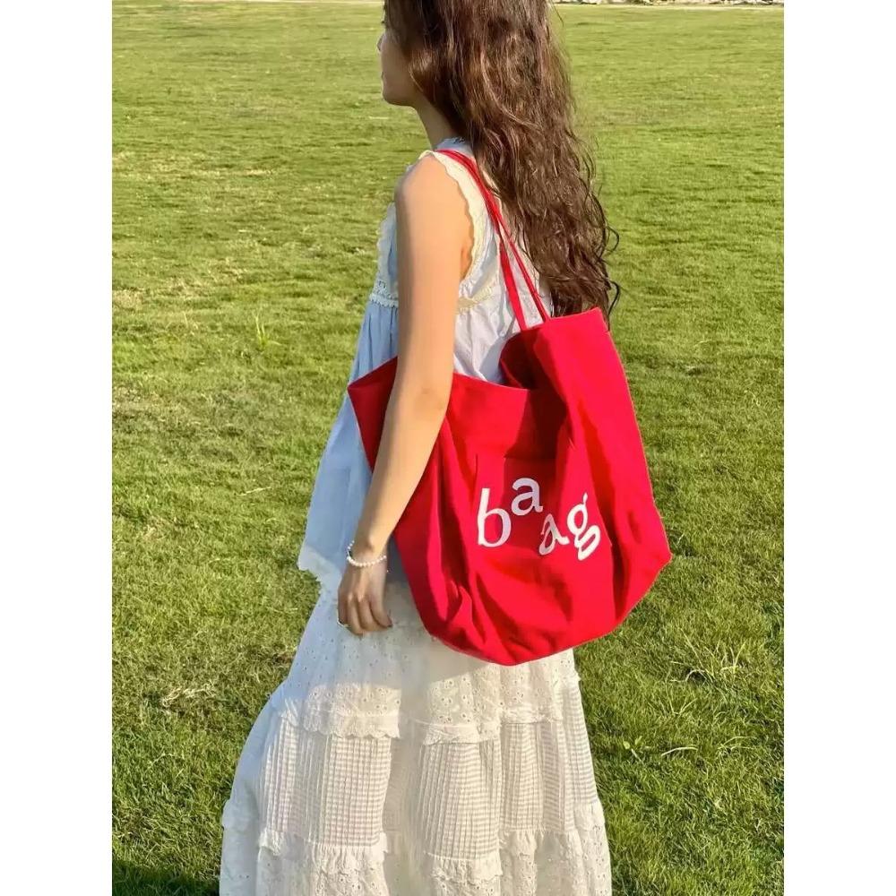 Korean Lazy Wind Large Capacity Red Letter Canvas Bag 2025 New Versatile Student Commuter Tote Bag for Class