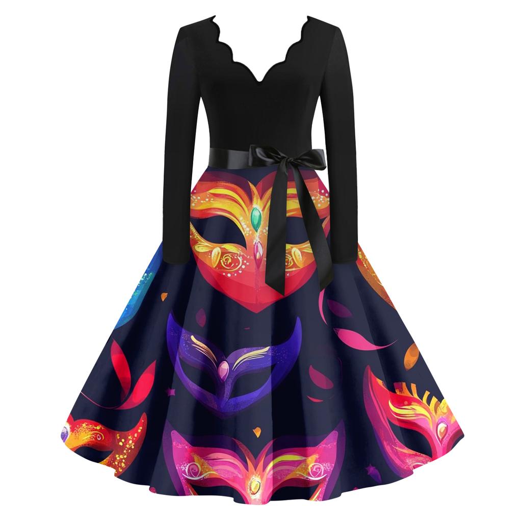 Dámské ležérní módní šaty s výstřihem do V, dlouhým rukávem, s potiskem, vintage, dlouhé