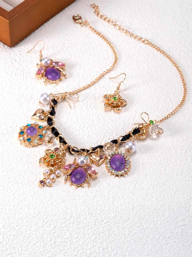 New metal gold-plated chain braided rope inlaid with gemstones bee petals stud earrings necklace set