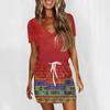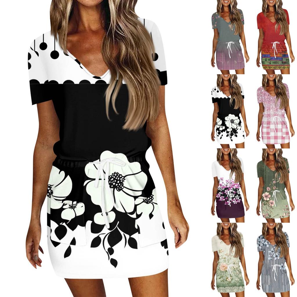 Women's Fashion Casual V-Neck Short Sleeve Drawstring Sequin Printed Dresses